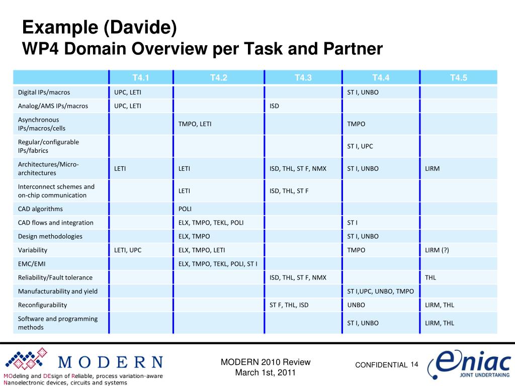 Example (Davide)WP4 Domain Overview per Task and Partner MODERN 2010 Review March 1st, 2011