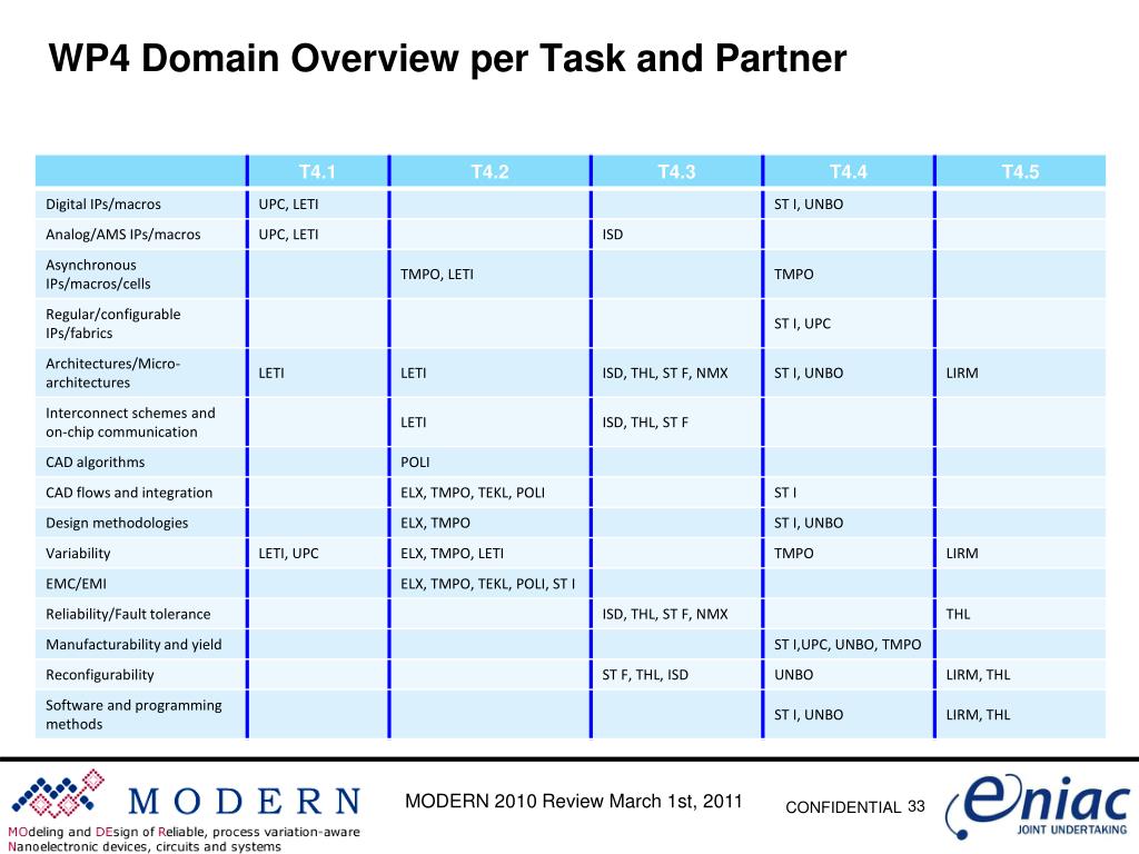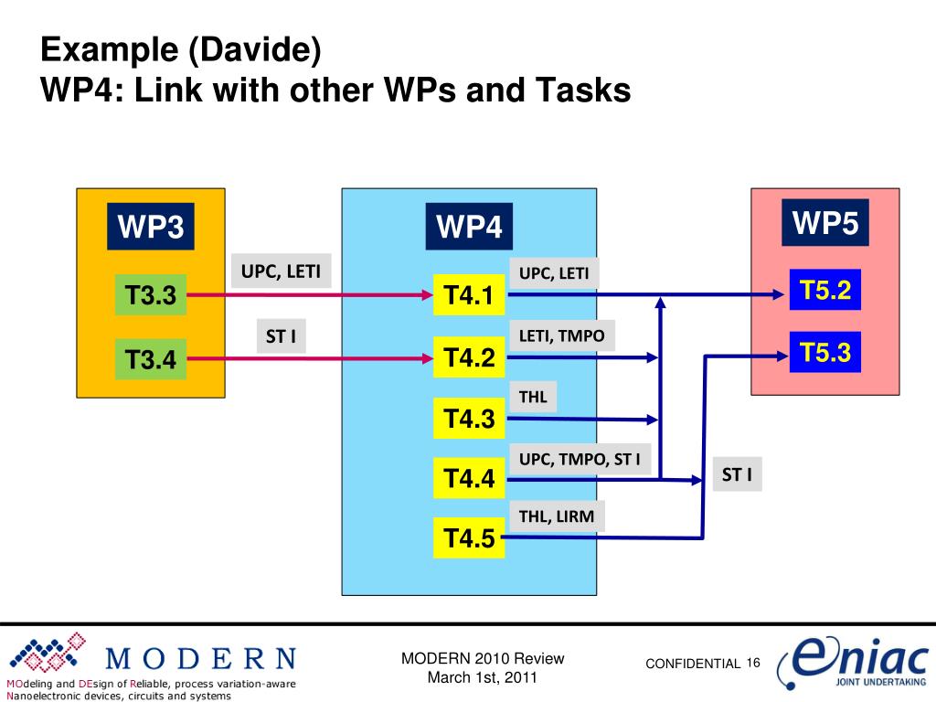 Example (Davide)WP4: Link with other WPs and Tasks WP5 WP3 WP4 UPC, LETI UPC, LETI T5.2 T3.3 T4.1 ST I LETI, TMPO T5.3 T4.2 T3.4 THL T4.3 UPC, TMPO, ST I ST I T4.4 THL, LIRM T4.5 MODERN 2010 Review March 1st, 2011