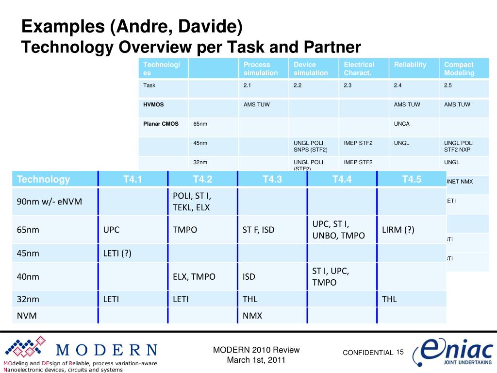Examples (Andre, Davide)Technology Overview per Task and Partner MODERN 2010 Review March 1st, 2011