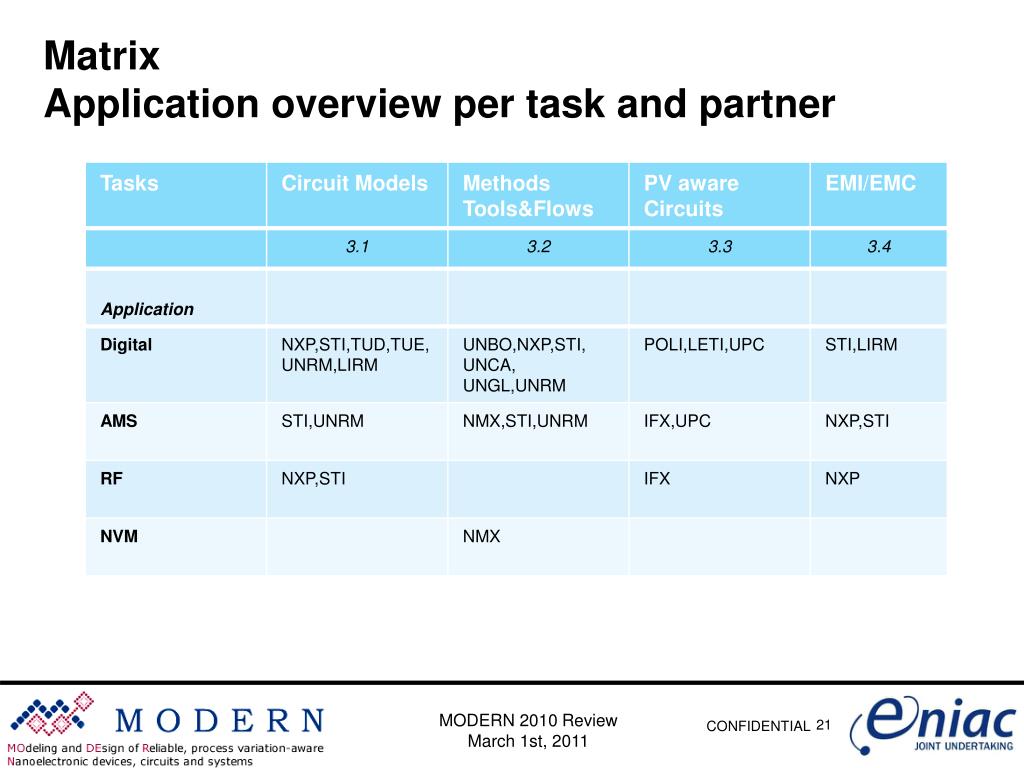 MatrixApplication overview per task and partner MODERN 2010 Review March 1st, 2011