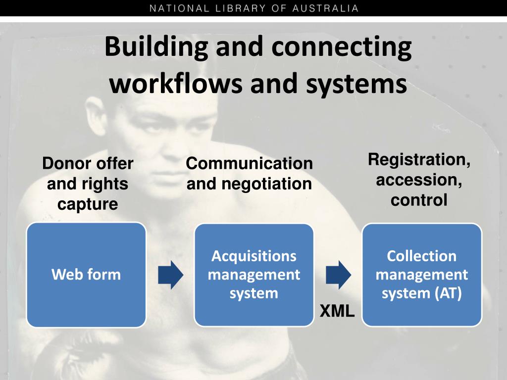 Building and connecting workflows and systems Registration, accession, control Donor offer and rights capture Communication and negotiation XML