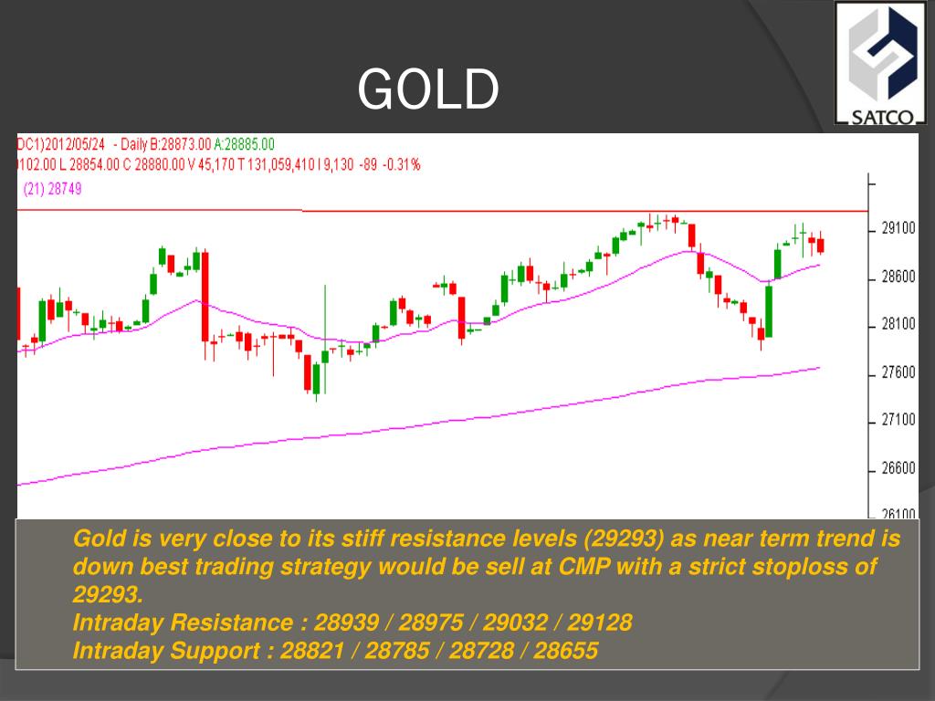 GOLD • Gold is very close to its stiff resistance levels (29293) as near term trend is down best trading strategy would be sell at CMP with a strict stoploss of 29293. • Intraday Resistance : 28939 / 28975 / 29032 / 29128 • Intraday Support : 28821 / 28785 / 28728 / 28655