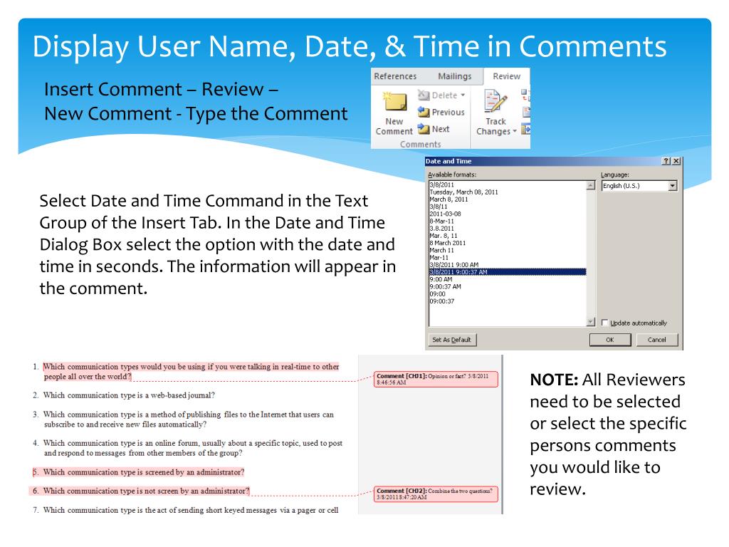 Display User Name, Date, & Time in Comments Insert Comment – Review – New Comment - Type the Comment Select Date and Time Command in the Text Group of the Insert Tab. In the Date and Time Dialog Box select the option with the date and time in seconds. The information will appear in the comment. NOTE: All Reviewers need to be selected or select the specific persons comments you would like to review.