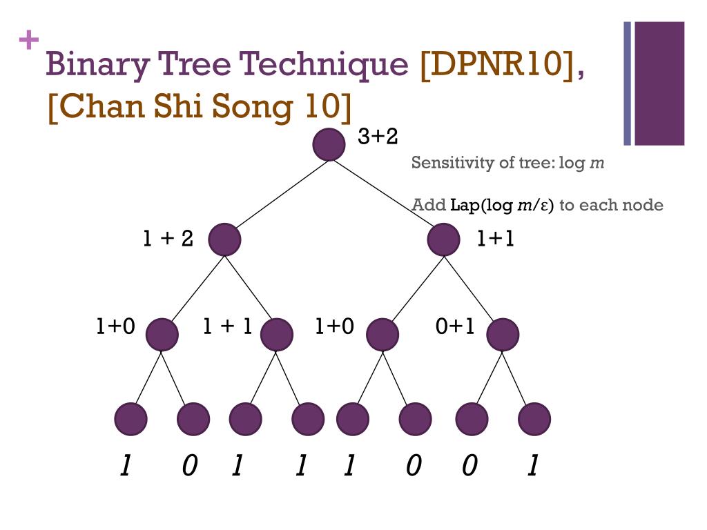 Binary Tree Technique 3+2 Each prefix: sum of log m nodes polylog error per query 1+1 1 + 2 1+0 1 + 1 1+0 0+1 1 0 1 1 1 0 0 1