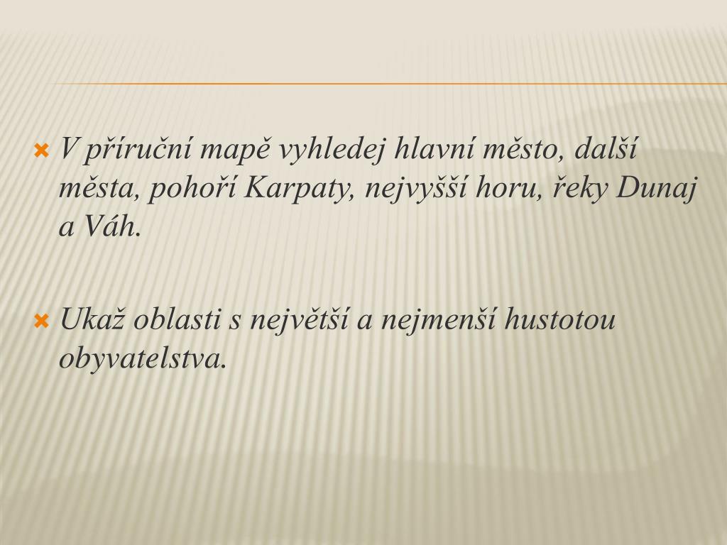 V příruční mapě vyhledej hlavní město, další města, pohoří Karpaty, nejvyšší horu, řeky Dunaj a Váh. Ukaž oblasti s největší a nejmenší hustotou obyvatelstva.