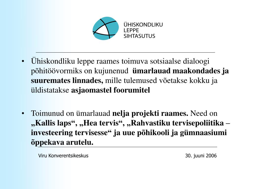 Ühiskondliku leppe raames toimuva sotsiaalse dialoogi põhitöövormiks on kujunenud ümarlauad maakondades ja suuremates linnades, mille tulemused võetakse kokkuja üldistatakse asjaomastel foorumitel • Toimunud on ümarlauad nelja projekti raames. Need on „Kallis laps“, „Hea tervis“, „Rahvastiku tervisepoliitika – investeering tervisesse“ ja uue põhikooli ja gümnaasiumi õppekava arutelu. Viru Konverentsikeskus 30. juuni 2006