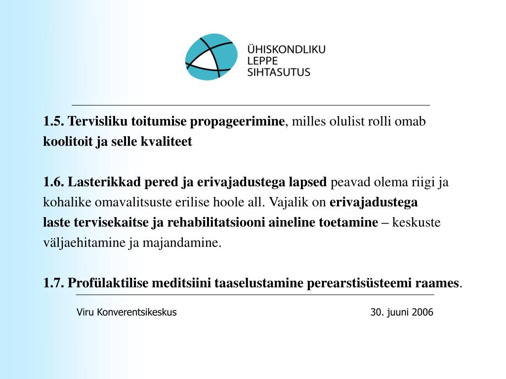 1.5. Tervisliku toitumise propageerimine, milles olulist rolli omab koolitoit ja selle kvaliteet 1.6. Lasterikkad pered ja erivajadustega lapsed peavad olema riigi ja kohalike omavalitsuste erilise hoole all.Vajalik on erivajadustega laste tervisekaitse ja rehabilitatsiooni aineline toetamine – keskuste väljaehitamine ja majandamine. 1.7. Profülaktilise meditsiini taaselustamine perearstisüsteemi raames. Viru Konverentsikeskus 30. juuni 2006