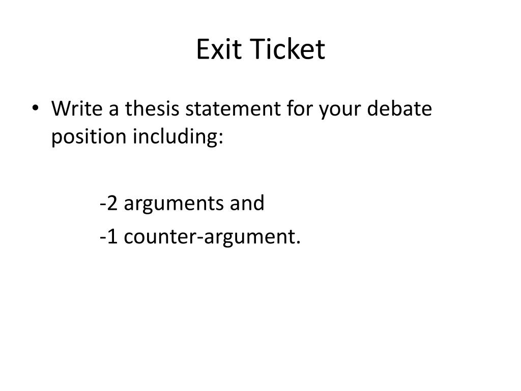 Exit Ticket • Write a thesis statement for your debate position including: -2 arguments and -1 counter-argument.
