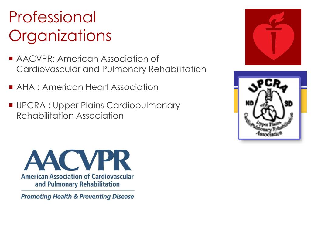 ProfessionalOrganizations AACVPR: American Association of Cardiovascular and Pulmonary Rehabilitation AHA : American Heart Association UPCRA : Upper Plains Cardiopulmonary Rehabilitation Association