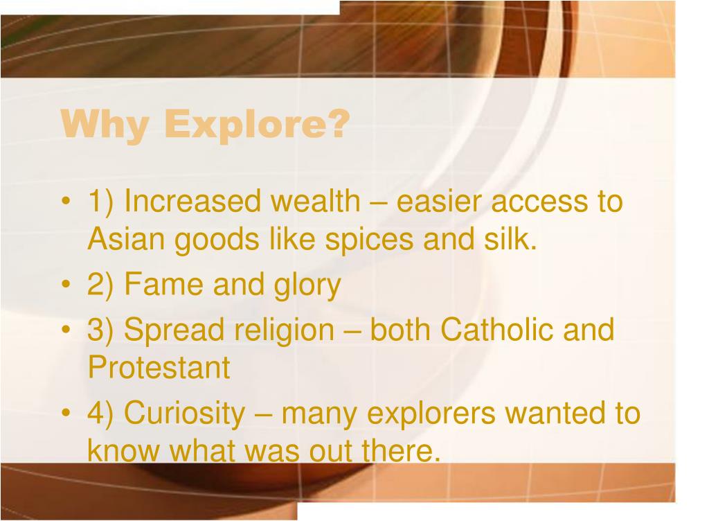 Why Explore? • 1) Increased wealth – easier access to Asian goods like spices and silk. • 2) Fame and glory • 3) Spread religion – both Catholic and Protestant • 4) Curiosity – many explorers wanted to know what was out there.