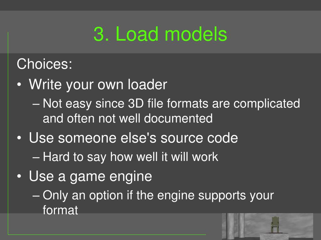 3. Load models Choices: • Write your own loader • Not easy since 3D file formats are complicated and often not well documented • Use someone else's source code • Hard to say how well it will work • Use a game engine • Only an option if the engine supports your format