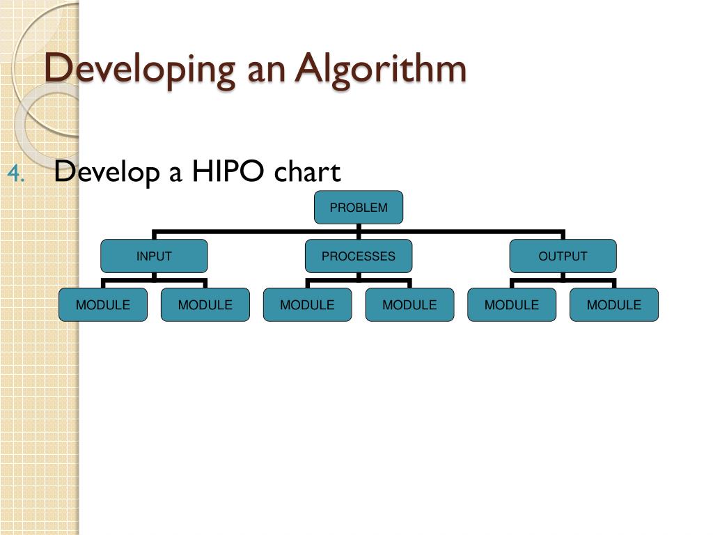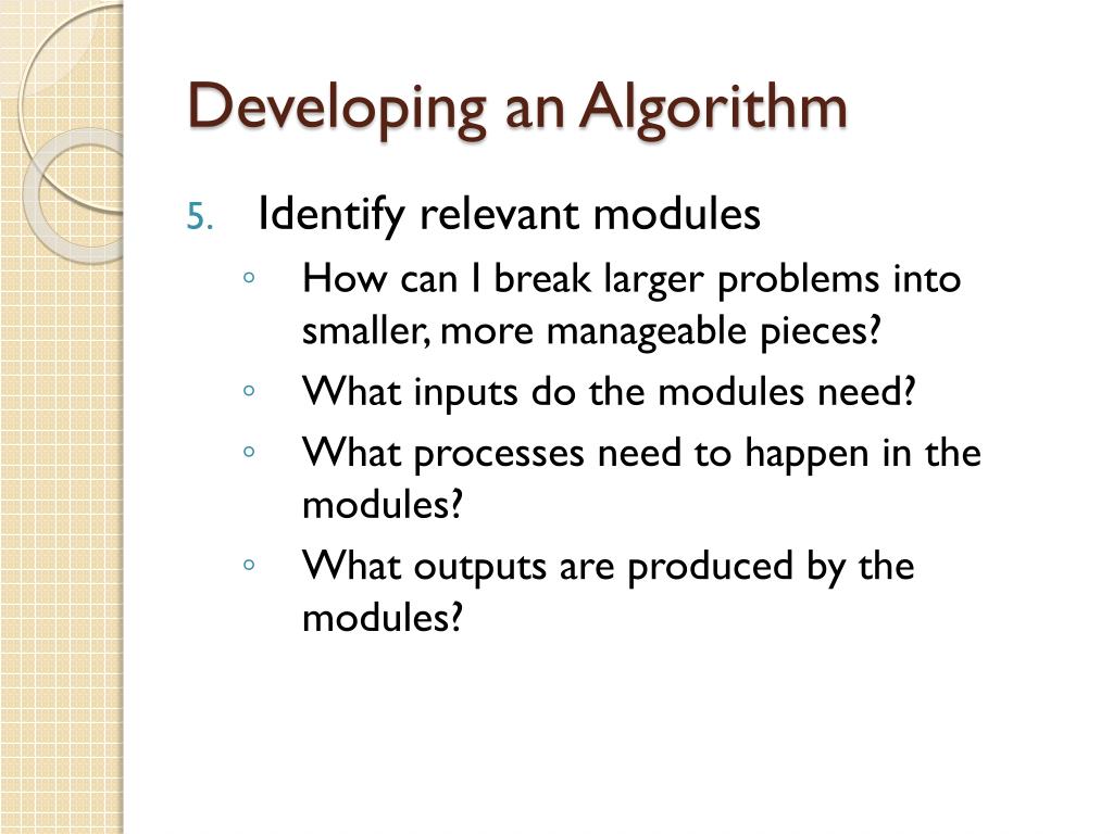 Developing an Algorithm • Identify relevant modules • How can I break larger problems into smaller, more manageable pieces? • What inputs do the modules need? • What processes need to happen in the modules? • What outputs are produced by the modules?