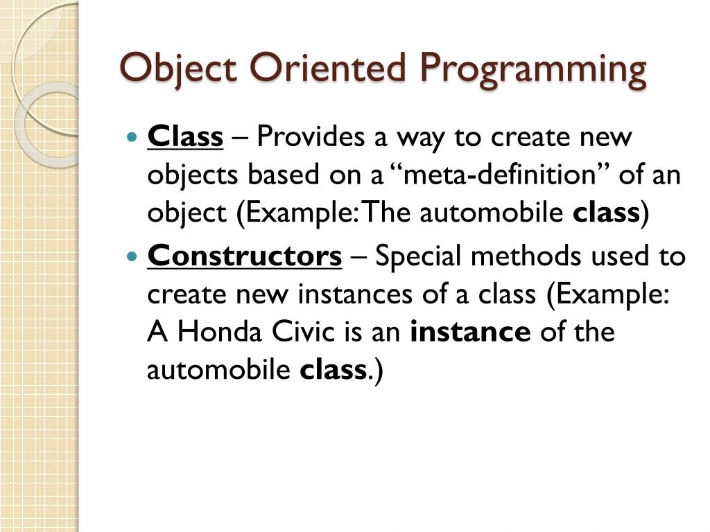 Object Oriented Programming • Class– Provides a way to create new objects based on a “meta-definition” of an object (Example: The automobile class) • Constructors– Special methods used to create new instances of a class (Example: A Honda Civic is an instanceof the automobile class.)