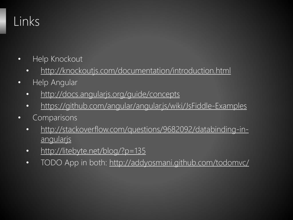 Links • Help Knockout • http://knockoutjs.com/documentation/introduction.html • Help Angular • http://docs.angularjs.org/guide/concepts • https://github.com/angular/angular.js/wiki/JsFiddle-Examples • Comparisons • http://stackoverflow.com/questions/9682092/databinding-in-angularjs • http://litebyte.net/blog/?p=135 • TODO App in both: http://addyosmani.github.com/todomvc/
