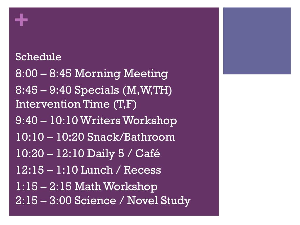 Schedule 8:00 – 8:45 Morning Meeting 8:45 – 9:40 Specials (M,W,TH) Intervention Time (T,F) 9:40 – 10:10 Writers Workshop 10:10 – 10:20 Snack/Bathroom 10:20 – 12:10 Daily 5 / Café 12:15 – 1:10 Lunch / Recess 1:15 – 2:15 Math Workshop2:15 – 3:00 Science / Novel Study