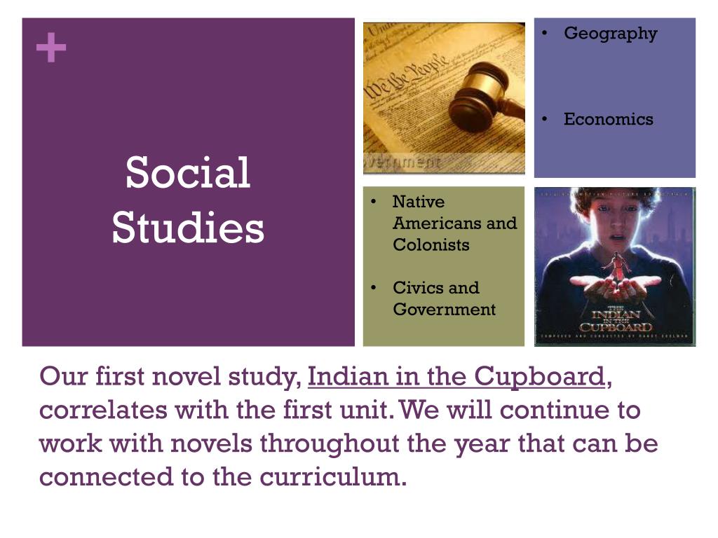 Geography • Economics Social Studies • Native Americans and Colonists • Civics and Government Our first novel study, Indian in the Cupboard, correlates with the first unit. We will continue to work with novels throughout the year that can be connected to the curriculum.