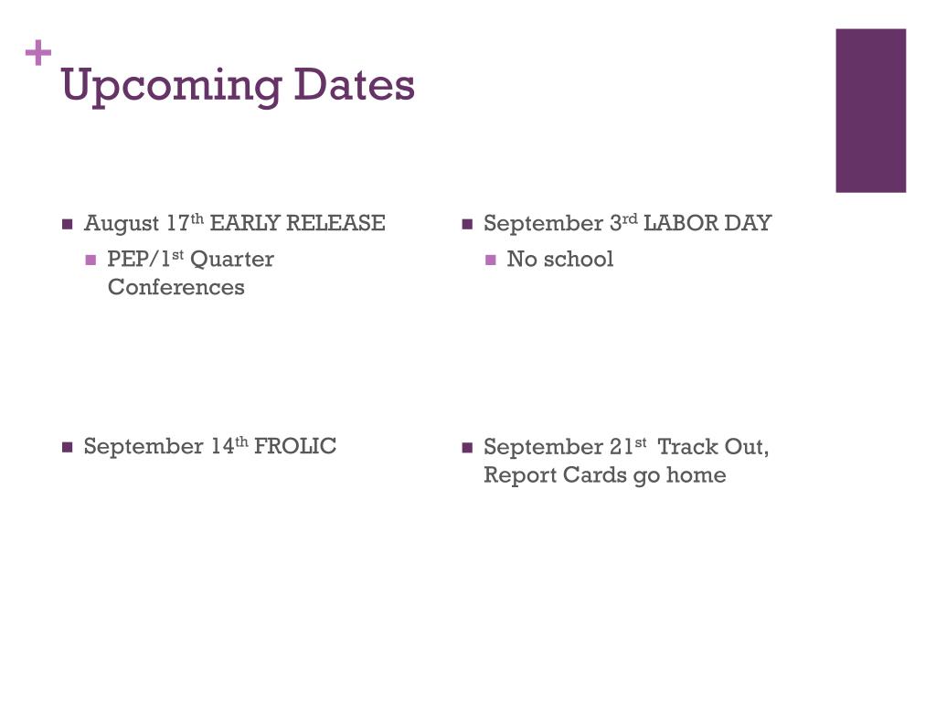 Upcoming Dates • August 17th EARLY RELEASE • PEP/1st Quarter Conferences • September 14th FROLIC • September 3rd LABOR DAY • No school • September 21st Track Out, Report Cards go home