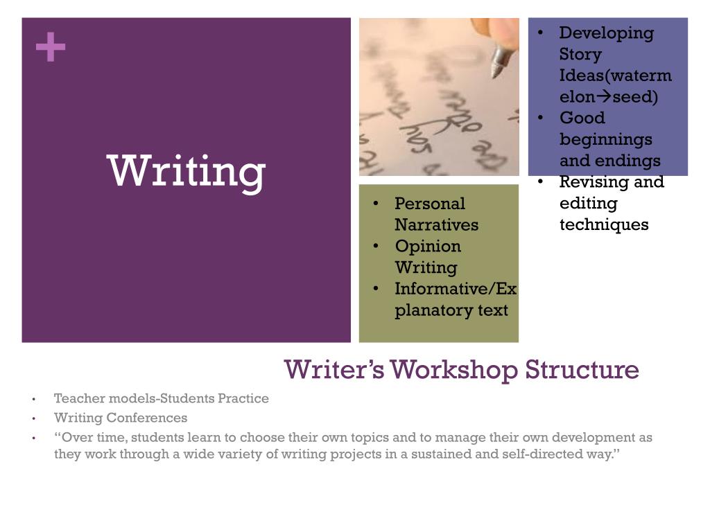 Developing Story Ideas(watermelonseed) • Good beginnings and endings • Revising and editing techniques Writing • Personal Narratives • Opinion Writing • Informative/Explanatory text Writer’s Workshop Structure Teacher models-Students Practice Writing Conferences “Over time, students learn to choose their own topics and to manage their own development as they work through a wide variety of writing projects in a sustained and self-directed way.”