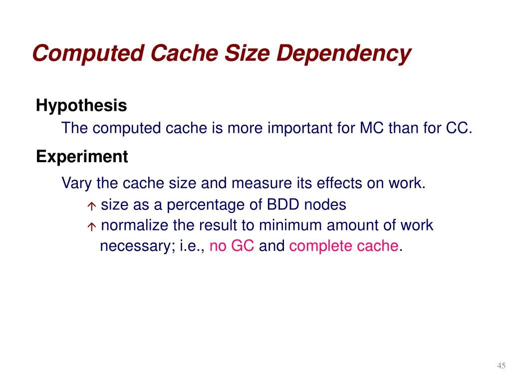 Computed Cache Size Dependency • Hypothesis • The computed cache is more important for MC than for CC. • Experiment • Vary the cache size and measure its effects on work. • size as a percentage of BDD nodes • normalize the result to minimum amount of work necessary; i.e., no GC and complete cache.