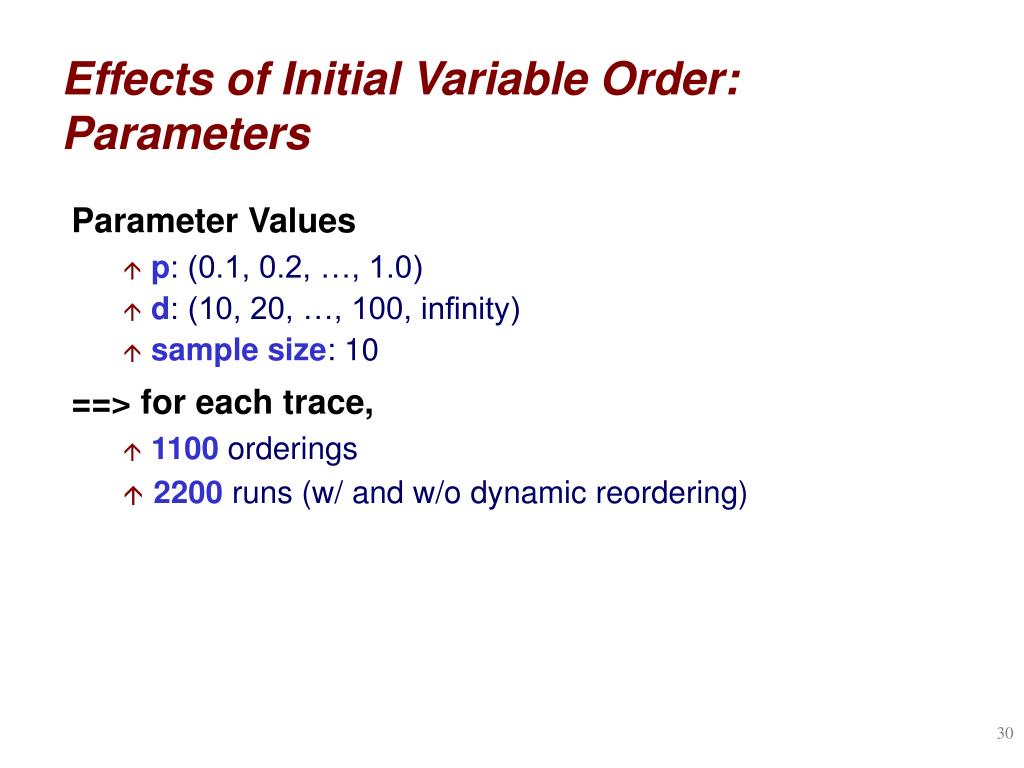 Effects of Initial Variable Order:Parameters • Parameter Values • p: (0.1, 0.2, …, 1.0) • d: (10, 20, …, 100, infinity) • sample size: 10 ==> for each trace, • 1100orderings • 2200runs (w/ and w/o dynamic reordering)