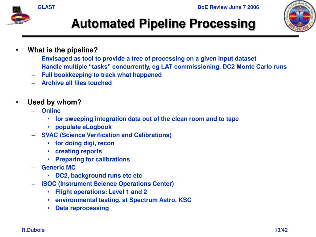 Automated Pipeline Processing • What is the pipeline? • Envisaged as tool to provide a tree of processing on a given input dataset • Handle multiple “tasks” concurrently, eg LAT commissioning, DC2 Monte Carlo runs • Full bookkeeping to track what happened • Archive all files touched • Used by whom? • Online • for sweeping integration data out of the clean room and to tape • populate eLogbook • SVAC (Science Verification and Calibrations) • for doing digi, recon • creating reports • Preparing for calibrations • Generic MC • DC2, background runs etc etc • ISOC (Instrument Science Operations Center) • Flight operations: Level 1 and 2 • environmental testing, at Spectrum Astro, KSC • Data reprocessing