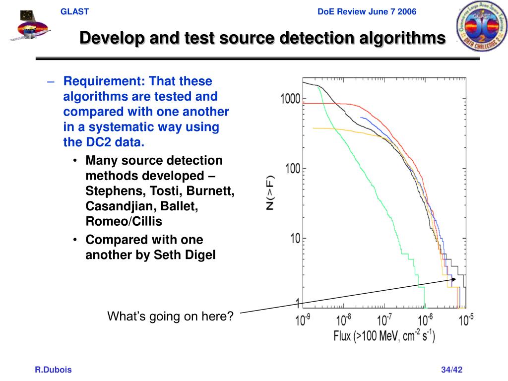 Develop and test source detection algorithms • Requirement: That these algorithms are tested and compared with one another in a systematic way using the DC2 data. • Many source detection methods developed – Stephens, Tosti, Burnett, Casandjian, Ballet, Romeo/Cillis • Compared with one another by Seth Digel What’s going on here?