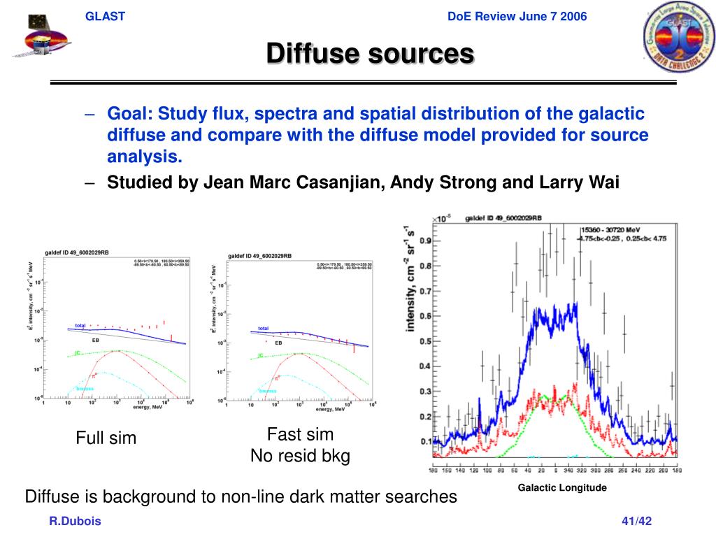 Diffuse sources • Goal: Study flux, spectra and spatial distribution of the galactic diffuse and compare with the diffuse model provided for source analysis. • Studied by Jean Marc Casanjian, Andy Strong and Larry Wai Fast sim No resid bkg Full sim Galactic Longitude Diffuse is background to non-line dark matter searches