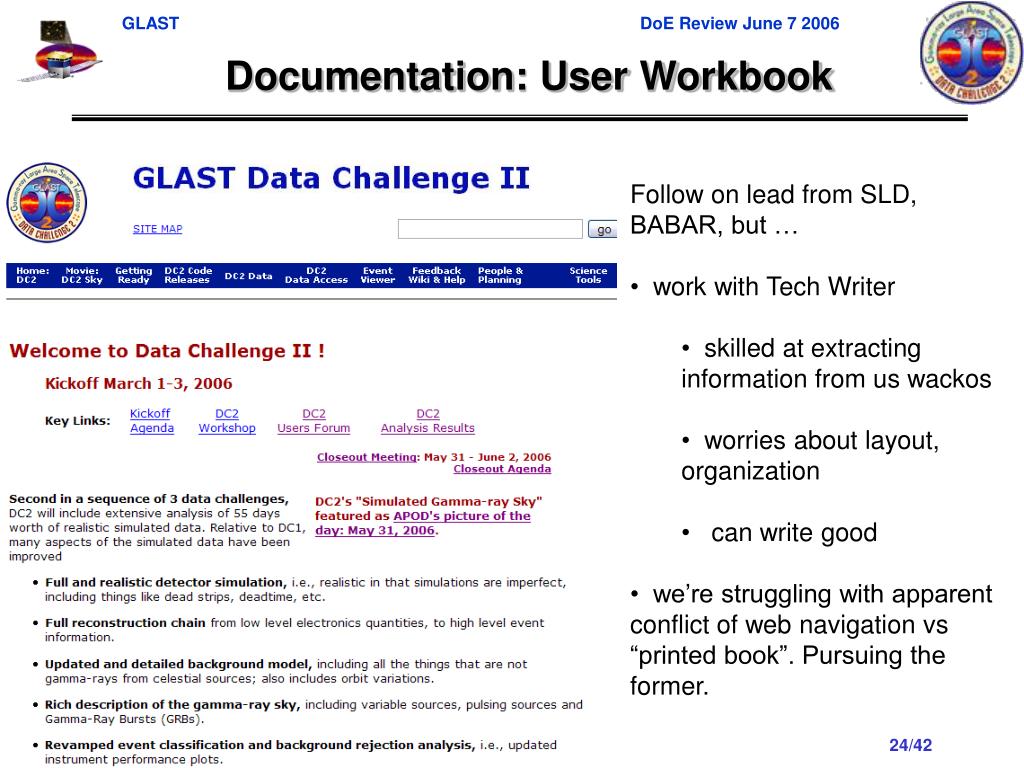 Documentation: User Workbook • Follow on lead from SLD, BABAR, but … • work with Tech Writer • skilled at extracting information from us wackos • worries about layout, organization • can write good • we’re struggling with apparent conflict of web navigation vs “printed book”. Pursuing the former.