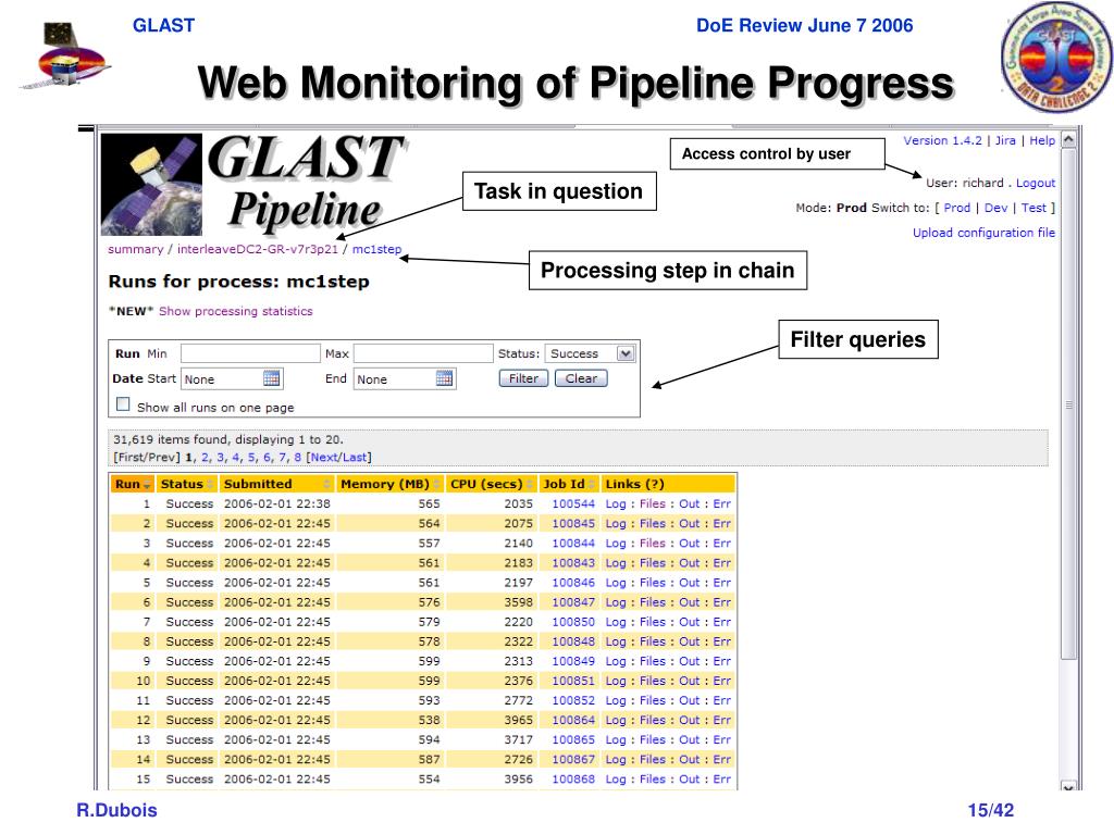 Web Monitoring of Pipeline Progress Access control by user Task in question Processing step in chain Filter queries