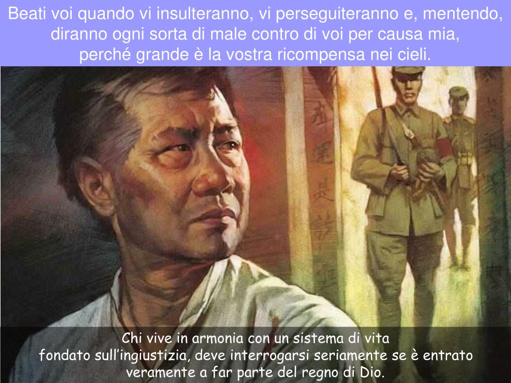 Beati voi quando vi insulteranno, vi perseguiteranno e, mentendo, diranno ogni sorta di male contro di voi per causa mia,perché grande è la vostra ricompensa nei cieli. Chi vive in armonia con un sistema di vitafondato sull’ingiustizia, deve interrogarsi seriamente se è entrato veramente a far parte del regno di Dio.
