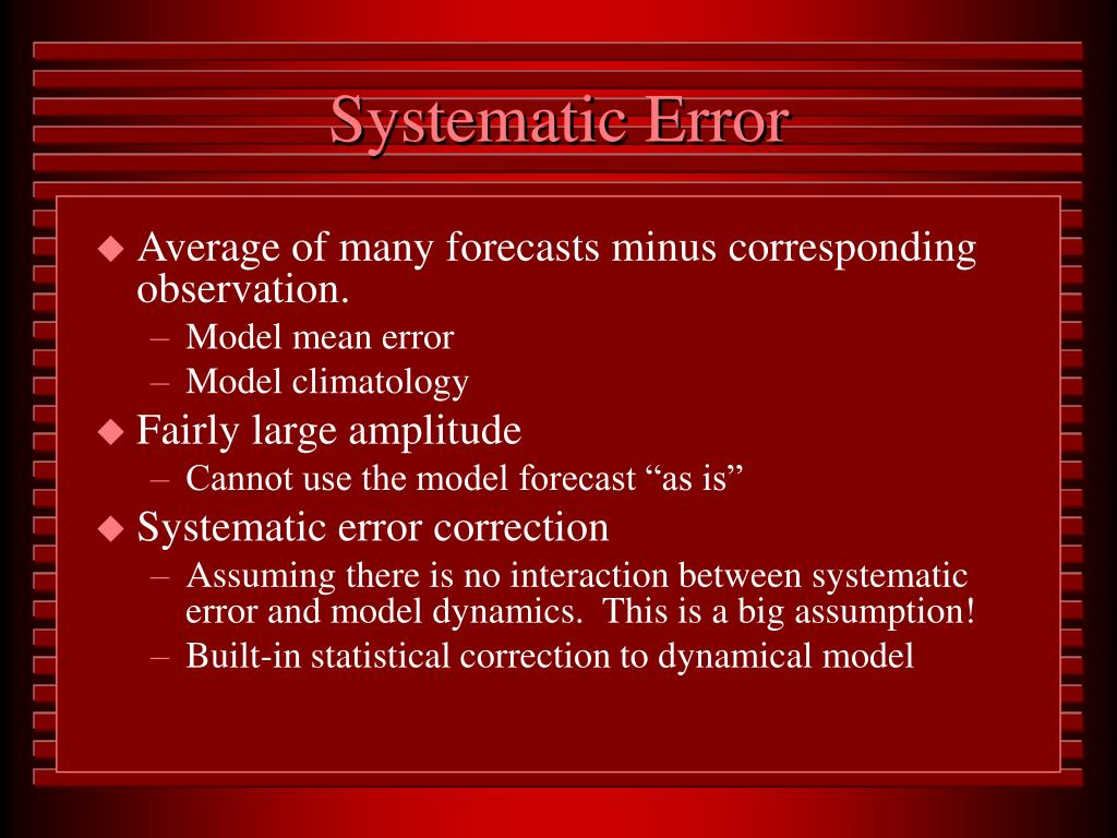 Systematic Error • Average of many forecasts minus corresponding observation. • Model mean error • Model climatology • Fairly large amplitude • Cannot use the model forecast “as is” • Systematic error correction • Assuming there is no interaction between systematic error and model dynamics. This is a big assumption! • Built-in statistical correction to dynamical model