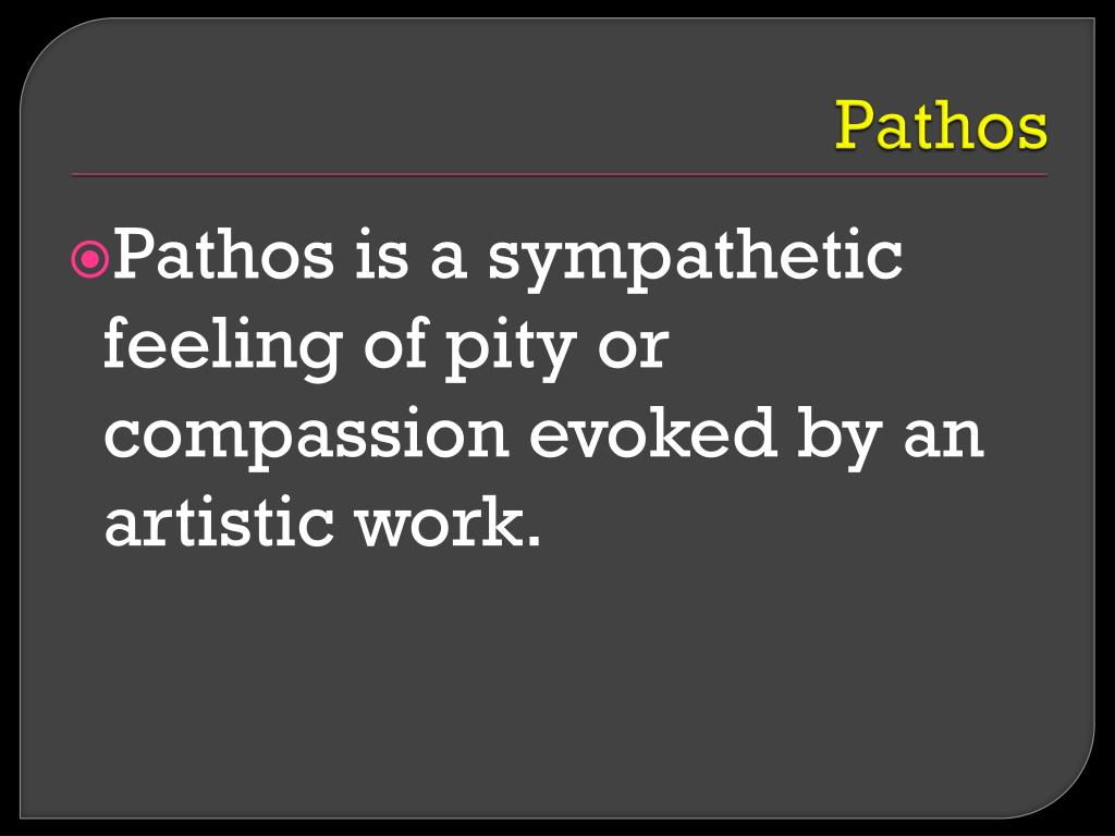 Pathos Pathos is a sympathetic feeling of pity or compassion evoked by an artistic work.