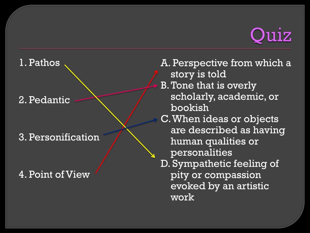 Quiz 1. Pathos 2. Pedantic 3. Personification 4. Point of View A. Perspective from which a story is told B. Tone that is overly scholarly, academic, or bookish C. When ideas or objects are described as having human qualities or personalities D. Sympathetic feeling of pity or compassion evoked by an artistic work