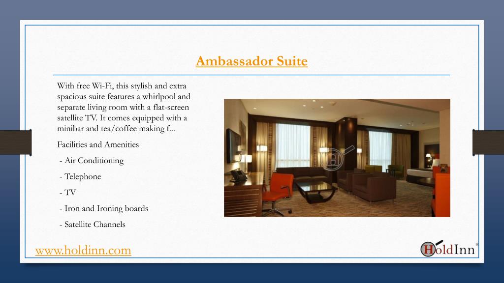 Ambassador Suite With free Wi-Fi, this stylish and extra spacious suite features a whirlpool and separate living room with a flat-screen satellite TV. It comes equipped with a minibar and tea/coffee making f... Facilities and Amenities - Air Conditioning - Telephone - TV - Iron and Ironing boards - Satellite Channels