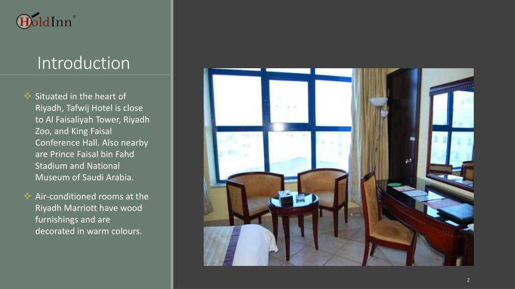 Introduction Situated in the heart of Riyadh, Tafwij Hotel is close to Al Faisaliyah Tower, Riyadh Zoo, and King Faisal Conference Hall. Also nearby are Prince Faisal bin Fahd Stadium and National Museum of Saudi Arabia. Air-conditioned rooms at the Riyadh Marriott have wood furnishings and are decorated in warm colours.