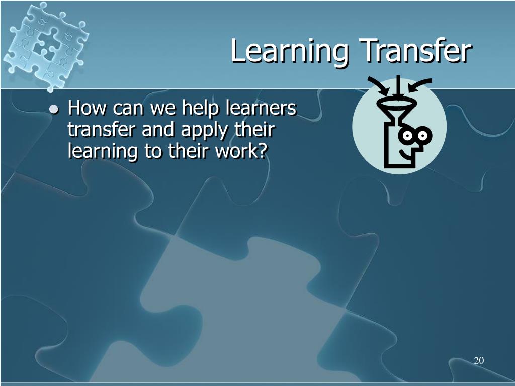Facilitating Transfer For greatest transfer, learners need to: • Associate new information with something they already know. • Fit new information into an existing, logical framework or pattern. • Move forward from a solid base of original learning. • See the benefit or criticality of information.