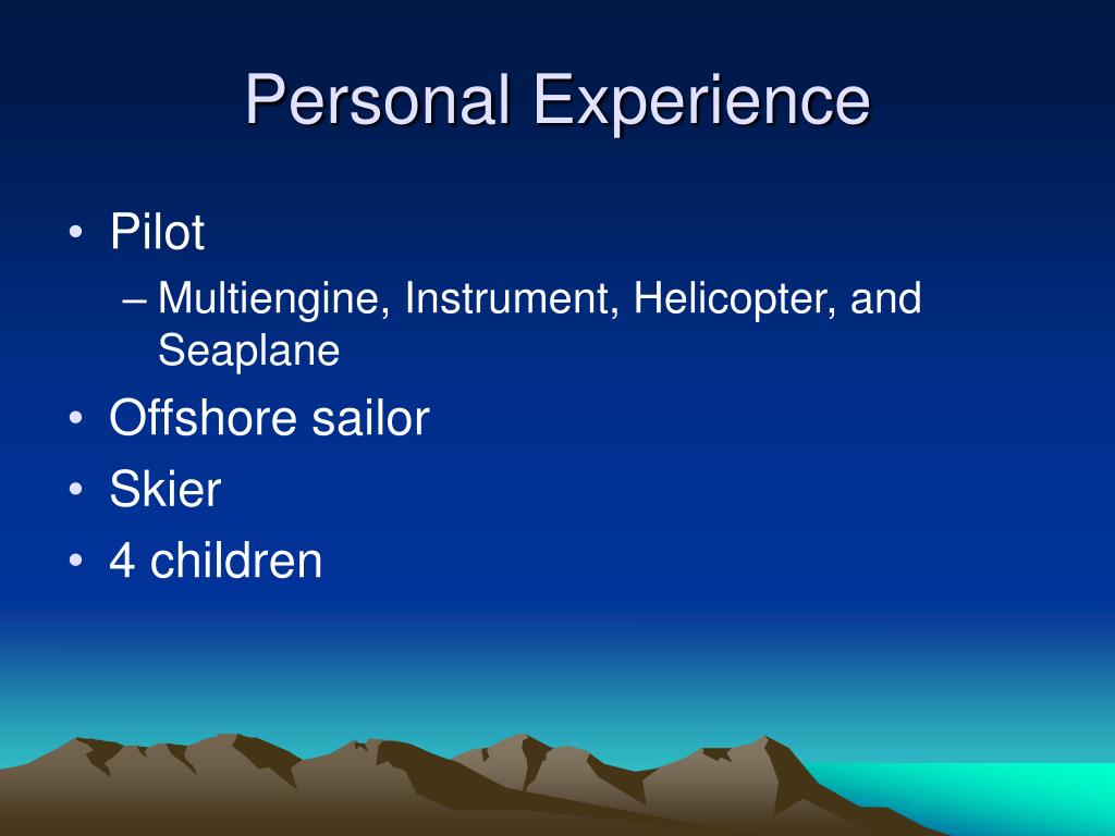 Personal Experience • Pilot • Multiengine, Instrument, Helicopter, and Seaplane • Offshore sailor • Skier • 4 children