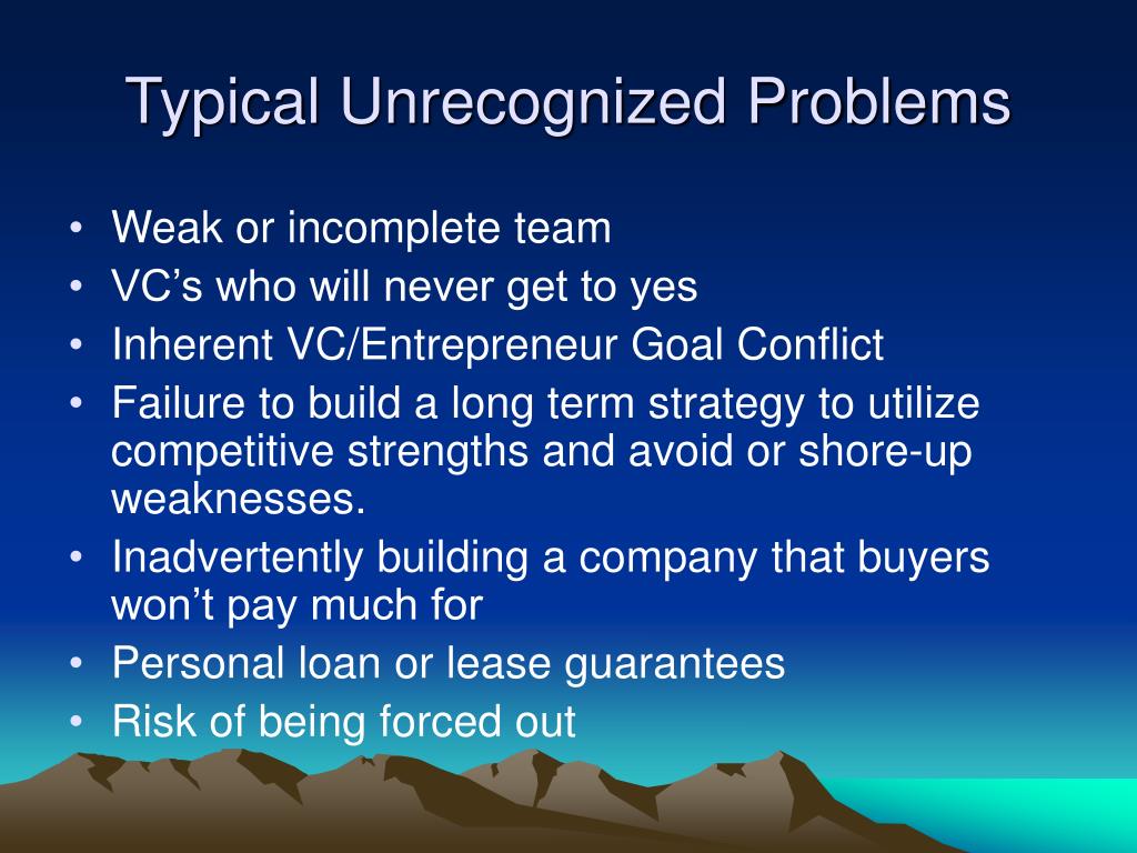 Typical Unrecognized Problems • Weak or incomplete team • VC’s who will never get to yes • Inherent VC/Entrepreneur Goal Conflict • Failure to build a long term strategy to utilize competitive strengths and avoid or shore-up weaknesses. • Inadvertently building a company that buyers won’t pay much for • Personal loan or lease guarantees • Risk of being forced out