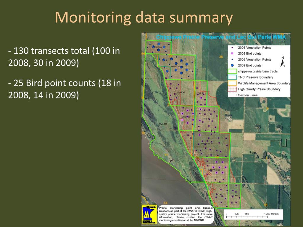 Chippewa Prairie monitoring • 130 transects total (100 in 2008, 30 in 2009) • 25 Bird point counts (18 in 2008, 14 in 2009)