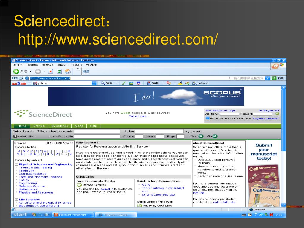 文献查阅 • 常用文献查阅的网站和搜索方法。 • Pubmed:美国国立医学图书馆期刊文献 • Sciencedirect: • 万方数据: • 清华同方CNKI-中国期刊全文数据库 • 重庆维普科技期刊全文数据库