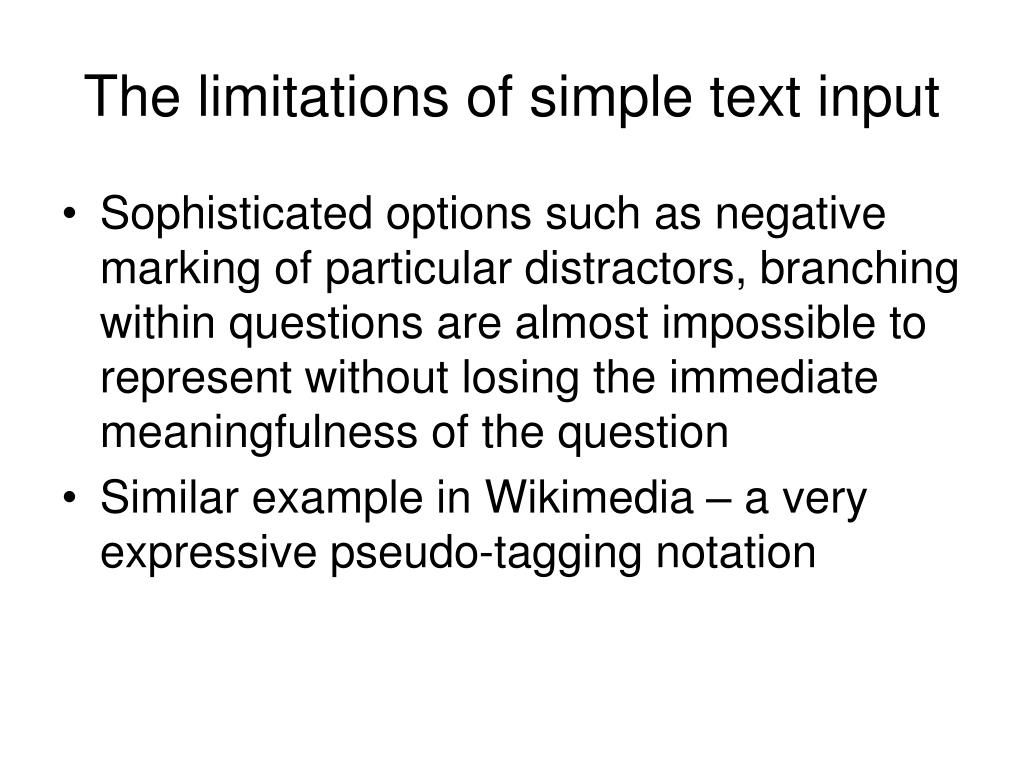The limitations of simple text input • Sophisticated options such as negative marking of particular distractors, branching within questions are almost impossible to represent without losing the immediate meaningfulness of the question • Similar example in Wikimedia – a very expressive pseudo-tagging notation