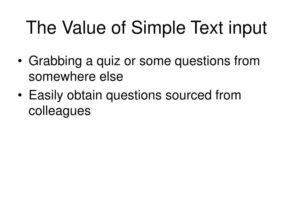 The Value of Simple Text input • Grabbing a quiz or some questions from somewhere else • Easily obtain questions sourced from colleagues