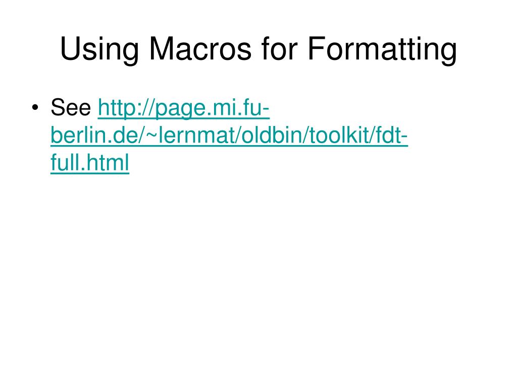 Using Macros for Formatting • See http://page.mi.fu-berlin.de/~lernmat/oldbin/toolkit/fdt-full.html