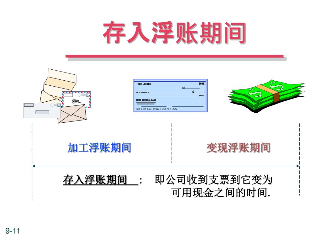 存入浮账期间 加工浮账期间 变现浮账期间 存入浮账期间 : 即公司收到支票到它变为 可用现金之间的时间.