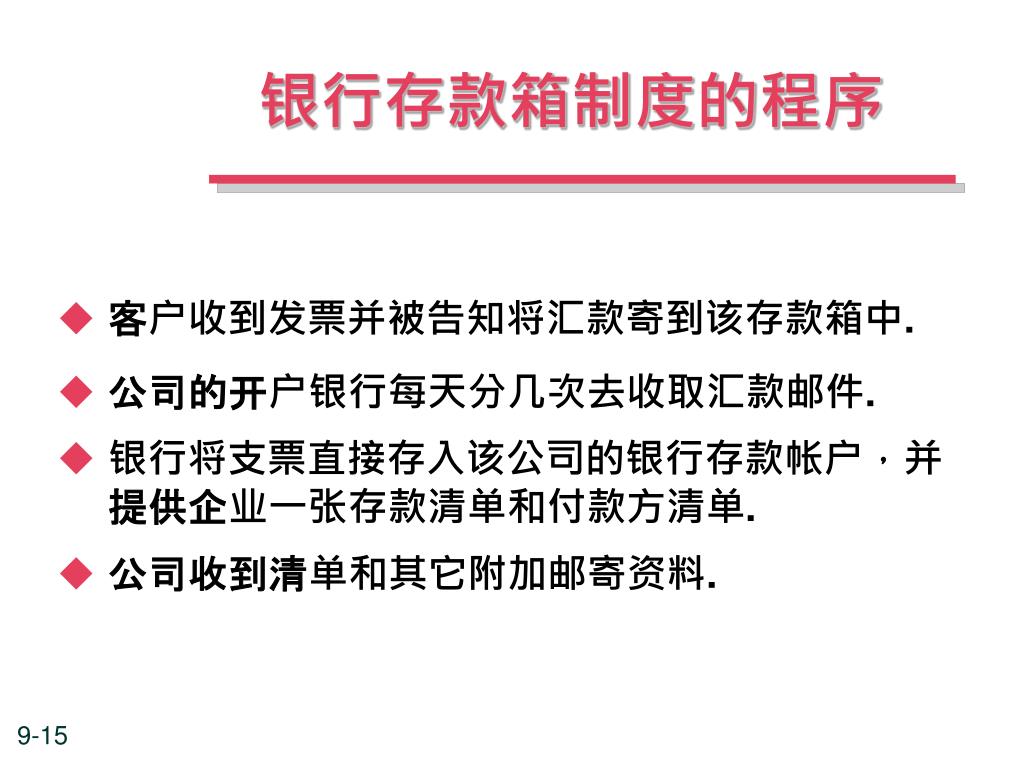 银行存款箱制度的程序 • 客户收到发票并被告知将汇款寄到该存款箱中. • 公司的开户银行每天分几次去收取汇款邮件. • 银行将支票直接存入该公司的银行存款帐户,并提供企业一张存款清单和付款方清单. • 公司收到清单和其它附加邮寄资料.
