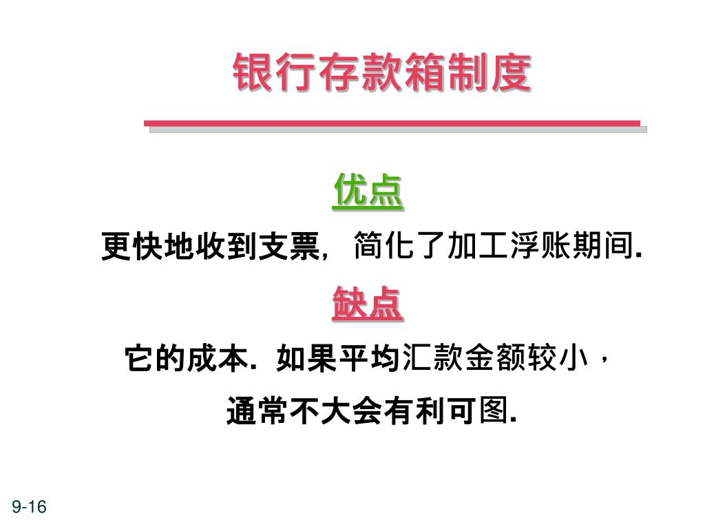 银行存款箱制度 优点 更快地收到支票,简化了加工浮账期间. 缺点 它的成本. 如果平均汇款金额较小, 通常不大会有利可图.