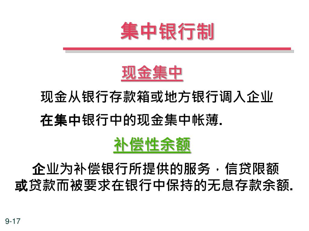 集中银行制 现金集中 现金从银行存款箱或地方银行调入企业 在集中银行中的现金集中帐薄. 补偿性余额 企业为补偿银行所提供的服务,信贷限额 或贷款而被要求在银行中保持的无息存款余额.