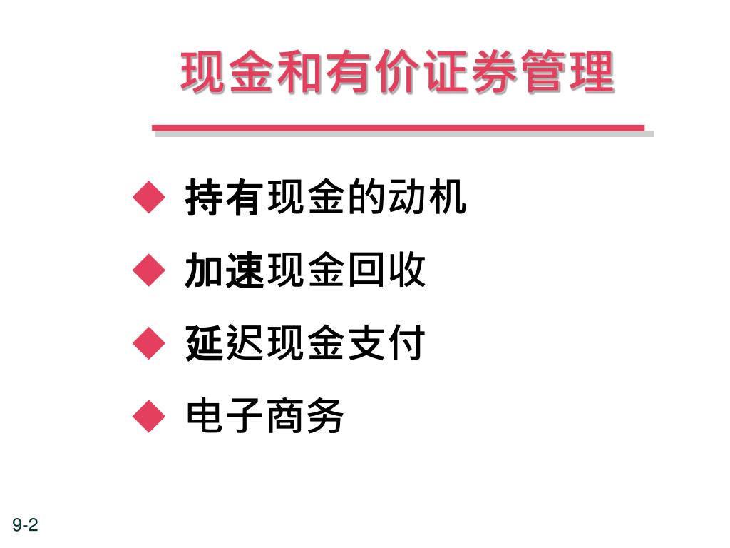 现金和有价证券管理 • 持有现金的动机 • 加速现金回收 • 延迟现金支付 • 电子商务
