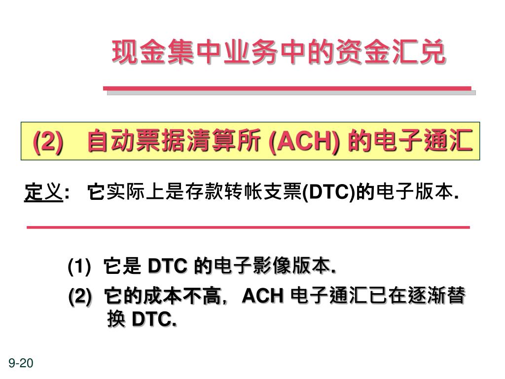 现金集中业务中的资金汇兑 定义: 它实际上是存款转帐支票(DTC)的电子版本. (1) 它是DTC 的电子影像版本. (2) 它的成本不高,ACH 电子通汇已在逐渐替 换 DTC. • (2) 自动票据清算所 (ACH) 的电子通汇