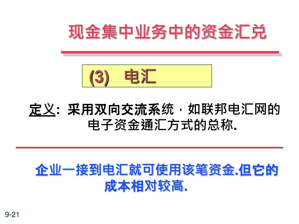 现金集中业务中的资金汇兑 定义: 采用双向交流系统,如联邦电汇网的电子资金通汇方式的总称. 企业一接到电汇就可使用该笔资金.但它的成本相对较高. • (3) 电汇